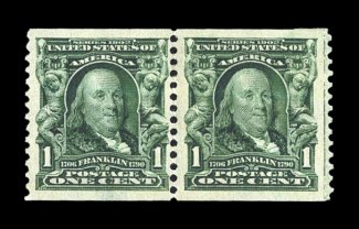 268 og 318 image#318, 1c Blue green coil, perf. 12 vert., an attractive mint pair of this very rare coil, with paste-up at right, well centered and margined, strong rich color, o.g., lightly hinged, a few minor perf. separations at top, very fine; it is believed that less than 100 pairs still exist; 1953 PF certificate. (Image) $16,500.00