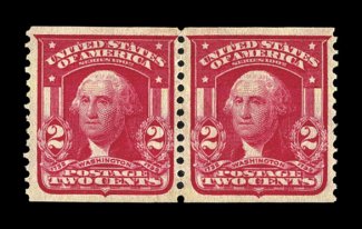270 og 322 image#322, 2c Carmine coil, perf. 12 vert., an incredibly handsome and choice mint pair of this important experimental coil rarity, possessing unusually deep rich color and a sharp impression, uncharacteristically well centered, full o.g. that has been relatively lightly hinged, extremely fine; an exceedingly rare coil as it is likely that there are not more than 150 to 175 genuine pairs still in existence; lightly signed "Stanley Gibbons" and accompanied by a 1963 PF certificate: ex-Chapin. (Image) $15,000.00