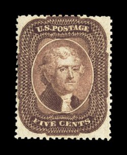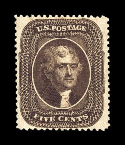 23 og 30A image#30A, 5c Brown, Ty. II, a highly desirable mint example of this very scarce classic stamp, being exceptionally well centered within much larger margins than typically found on this narrowly spaced stamp, strikingly deep color and a razor-sharp impression, full o.g., lightly hinged, extremely fine; because this stamp was not remaindered (unlike its Orange brown counterpart), mint examples are seldom encountered, and only a tiny fraction of these are found in the outstanding condition of this stamp; 2005 PF certificate. (Image) $2,250.00