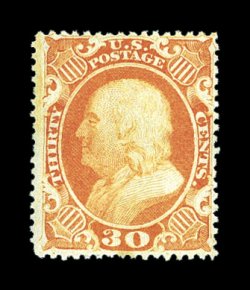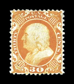 35 og 46 image#46, 30c Yellow orange reprint, without gum as issued, a highly select example of this rare and difficult reprint, possessing about as perfect centering as is possible on this typically tightly margined stamp, intense color that is both vibrant and rich, plus its impression is much stronger than usual, extremely fine; a terribly difficult stamp to find this choice; 2004 PSE certificate; ex-Menjou, Chapin. (Image) $3,250.00