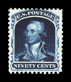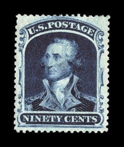 28 og 39 image#39, 90c Blue, exceedingly well centered amid large and wonderfully well balanced margins, deep luxuriant color and a razor-sharp impression, full o.g., lightly hinged, an extremely fine gem; premium quality Ninety Cent 1860 Issues, especially with full original gum, are extraordinarily difficult to find; 2000 PF certificate; ex-Gilbert. (Image) $3,500.00
