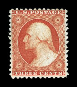 30 og 41 image#41, 3c Scarlet reprint, without gum as issued, a gem example of this very scarce and perennially difficult reprint, featuring outstanding centering for this, especially when one considers how poorly centered many of these can come, with much larger margins than usual, strong vibrant color and a crisp impression on bright paper, extremely fine; among the finest available of the 479 sold; 2003 PF certificate. (Image) $3,250.00