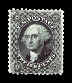 25 og 36 image#36, 12c Black, plate I, much better centering than typically found on this terribly difficult stamp, strong color, full o.g., lightly hinged, choice very fine; the Twelve Cent Type I stamp is far more elusive to find in premium condition than its Ty. II counterpart (#36b); 1989 PF certificate. (Image) $1,500.00