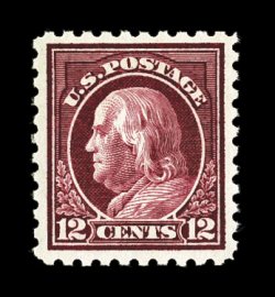 426 nh 474 image#474, 12c Claret brown, gorgeous bright rich color and a crisp detailed impression on bright white paper, uncommonly well centered and margined, pristine o.g., n.h., extremely fine; 2003 PF certificate and a 2005 PSE certificate (XF 90; SMQ $385.00); ex-Gilbert. (Image) $130.00