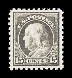 427 nh 475 image#475, 15c Gray, especially well centered within unusually large margins, extraordinarily fresh color and paper, o.g., n.h., extremely fine and quite choice; 2001 PF certificate for a block of four, this being the bottom left stamp. (Image) $425.00