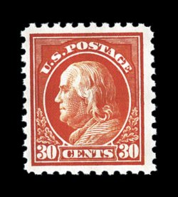 429 nh 476A image#476A, 30c Orange red, the extremely rare unwatermarked, perforated 10 issue, an incredibly fresh and desirable mint example of this notoriously difficult and elusive stamp, possessing a marvelous overall freshness, with rich luxuriant color and a sharp detailed impression on bright paper, while centered just slightly to the left, this is actually far better centered than the vast majority of the small existing population (most are strongly off center, often well into the design), pristine o.g., never hinged, very fine and exceedingly choice; one of the rarest U.S. stamps of the 20th century, with only two sheets recorded (200 stamps total), this being position 83 from the plate no. 6911 sheet; 1984 (photocopy) and 2005 PF certificates. (Image) for fine $9,000.00
