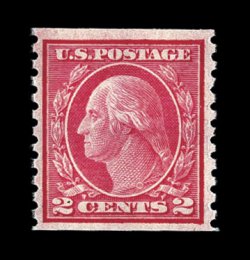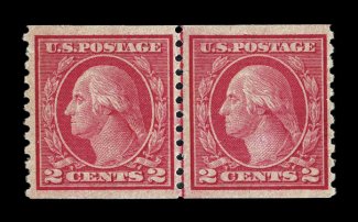 437 og 491 image#491, 2c Carmine coil, Ty. II, perf. 10 vert., extraordinarily rare mint joint line pair, being well centered for this difficult issue, deep carmine color that is characteristic of genuine properly identified examples, o.g., lightly hinged, very fine and an especially attractive example of this rarity that ranks among the rarest of the 20th century issues of the United States; signed George B. Sloane and accompanied by 1989 PF and 1991 PSE certificates; ex-Weisman. (Image) $12,000.00