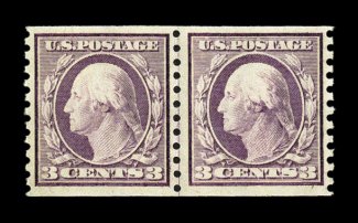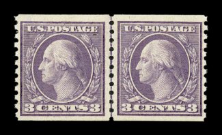 435 nh 489 image#489, 3c Violet coil, perf. 10 horiz., an especially desirable joint line pair, remarkably well centered within large margins, warm color, o.g., n.h., extremely fine; this is the sole line pair to achieve a grade of 95, the highest awarded to date; 2004 and 2006 PSE certificates (latter grading XF-Superb 95; SMQ $355.00). (Image) $70.00