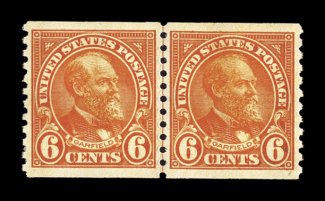 481 nh 723 image#723, 6c James A. Garfield coil, joint line pair, exceedingly well centered within large margins, strong color and impression, o.g., n.h., extremely fine; almost never encountered in this gem quality; 2005 PSE certificate. (Image) $85.00