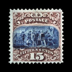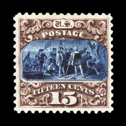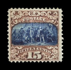 100 og 129 image#129, 15c Brown and blue re-issue, Ty. III, a marvelous mint single, being incredibly well centered amid large margins, plus its colors could not be more intense, nor its impression more prooflike on pristine paper, unusually even and intact perforations all around, full o.g., lightly hinged, extremely fine in every regard; certainly one of the finest among the 1,981 sold; 2004 PF certificate. (Image) $1,900.00