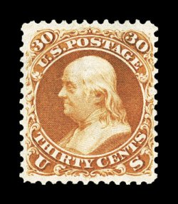 81 og 110 image#110, 30c Brownish orange re-issue, a highly desirable mint example of this rare and difficult re-issue, exceptionally well centered, particularly for the Thirty Cent value, which is the most difficult of all the re-issues to find well centered, sumptuously rich color and a highly detailed impression, full o.g., lightly hinged, extremely fine; in far superior condition to the vast majority of the 346 sold; 1968 and 2005 PF certificates, and a 2006 PSE certificate (VF-XF 85; SMQ $11,800.00); ex-"Beckley". (Image) $7,000.00