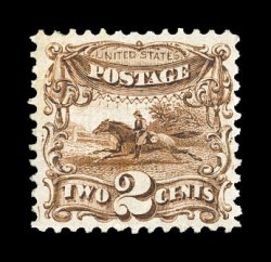 95 og 124 image#124, 2c Brown re-issue, a highly select mint example that is impeccably well centered within large margins, plus its color is uncommonly rich and its impression is deeply etched on fresh white paper, o.g., lightly hinged, extremely fine; actually a rare stamp in this outstanding quality; 1991 PF certificate. (Image) $800.00