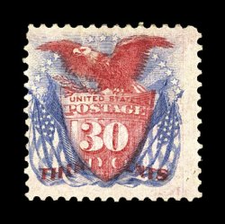 92 og 121 image#121, 30c Blue and carmine, wonderfully fresh and rich colors, centered a bit to left but not objectionably so, full o.g., fine; a very rare sound original gum example of the Thirty Cent 1869 Pictorial; 1997 PF certificate; ex-Lessin. (Image) $8,000.00