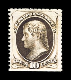137 og 172 image#172, 10c Pale brown special printing, without gum as issued, an exceptionally handsome and choice example of this very rare special printing, well centered within much larger margins than typically found, bright rich color, scissor-separated as usual but nearly full intact perforations on three sides, very fine; less than 40 copies have been recorded, and only a handful of these exist both sound and well centered; 1966 and 2004 PF certificates; ex-Lilly. (Image) $16,000.00