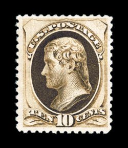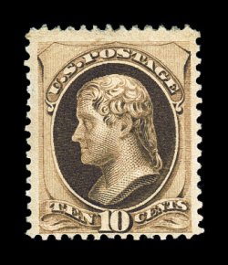 150 og 187 image#187, 10c Brown, without secret mark, uncharacteristically well centered within large margins, strong rich color, full o.g., lightly hinged, very fine; an exceedingly fresh and choice example of this very scarce mint Bank Note; photocopy of a 1985 PF certificate for a block of four, this being the top right stamp, as well as a 1992 PF certificate for the single; ex-"Vineyard". (Image) $3,500.00