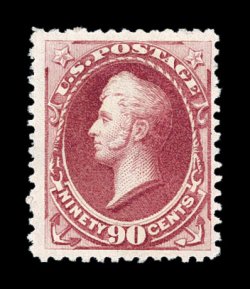 161 og 202 image#202, 90c Dull carmine special printing, without gum as issued, a highly desirable premium quality example of this important United States rarity, possessing outstanding centering for this, particularly when compared to other known copies, warm rich color on bright paper, intact perforations, very fine and quite choice; probably no more than 40 copies exist of this value, the majority of which are found strongly off center or have small faults, making this among the very finest available; 1953 and 2001 PF certificates; ex-Lewis. (Image) $32,500.00