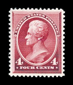 172 nh 215 image#215, 4c Carmine, a marvelous pristine mint single, possessing an overall freshness and crispness which belies its age, with sumptuously rich color and prooflike impression on bright paper, very nearly perfectly centered within uncommonly large margins, immaculate o.g., never hinged, extremely fine; a true "post office" fresh gem; 1999 and 2006 PF certificates. (Image) $800.00