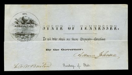 501 c imageAndrew Johnson, Seventeenth President of the United States, autographed document signed as Governor of the State of Tennessee prior to his presidency, handsome illustrated document for the appointment of Justice of Peace appointing Joseph R. Sykes as Justice of the Peace in Madison County, document refolded for display and accompanied by the original cover to the Sheriff in Madison County, very fine and an uncommon signature. (Image) Est. 500-750