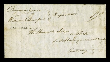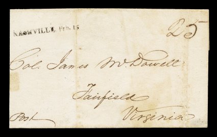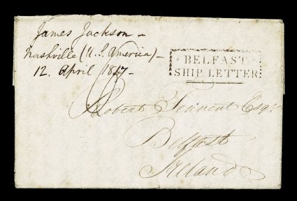 503 c imageNashville, Tennessee desirable stampless cover collection tracing the early postal history of Nashville from 1800 to 1854, 26 in all, the earliest cover is a September 7, 1800 cover from the Henley correspondence with the small "NASHVILLE, T. Sept 7" straight line handstamp (26x2mm) and a second strike on "Sep 21" (without the "t") on the same cover, there is a slave-carried 1801 cover with that fact confirmed in the contents, we count five other different straight line cancels between 1808 and 1813 plus three different ovals including an unlisted variety with "Tennessee" inverted, various others with c.d.s. postmarks and rates, four are foreign mail covers to Great Britain and Europe including an 1817 fancy boxed "Belfast/Ship Letter", condition varies with some fold breaks on some of the early covers, overall fine-very fine and a wonderful documentation of the scarce postal history of this city. (imagea) (imageb) (Image) Est. 1,000-1,500