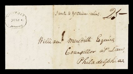 504 c image"NASHVILLE T April.17." straight line postmark on folded 1804 entire letter to Pittsburgh, Pennsylvania, this is the first small type straight line that is listed as 26x2mm, this well struck example is actually only 25mm long lacking any punctuation after "Nashville", ms. "25" rate marking, minor soiling to cover, very fine; a nice variety of a very early and rare Nashville marking. (Image) Est. 300-400