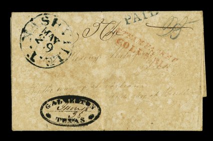 506 c image"Nashville/T/May29" blue c.d.s. postmark on 1838 folded cover to Matagorda, Republic of Texas, sent via New Orleans with blue "Paid" and ms. "25" rate marking, put aboard a gulf steamer with scarce red "Steampacket/Columbia" two-line handstamp, to Galveston where a beautiful strike of "Galveston/Texas/June 18, 38" ornamented oval was applied, old rate crossed out and new rate of "56 1/4" was collected consisting of 50c Texas rate and 6 1/4c ship fee, very fine and attractive; a wonderful cover with a rare combination of scarce markings. (Image) Est. 1,000-1,500