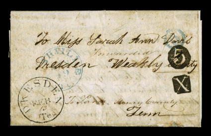 507 c image"Nashville/Te/Jan 19" blue c.d.s. on 1847 folded letter, originally posted to Dresden in Weakly Co. Tennessee with "5" in fancy scalloped circle rate marking in blue, at Dresden it was forwarded to Paris, Tennessee in Henry Co. receiving a black c.d.s. of Dresden, plus beautifully struck negative "5" in circle for the additional forwarding postage, then a negative "X" in box to indicate the total of 10c to be collected, both of these negative markings are very attractive and desirable and it is rare to find both of them on the same cover, minor edge flaws at bottom of cover, a very fine letter with considerable eye appeal. (Image) Est. 200-300