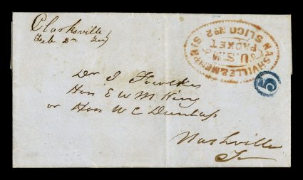 508 image"Nashville & Memphis/U.S.M. Packet/Slico No. 2" oval steamer marking on entire folded letter, beautifully struck in red and put on the steamer at Clarksville on the Cumberland River to Nashville, bold blue "5" in circle rate handstamp, a very fine and a particularly handsome cover. (Image) Est. 500-750