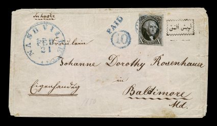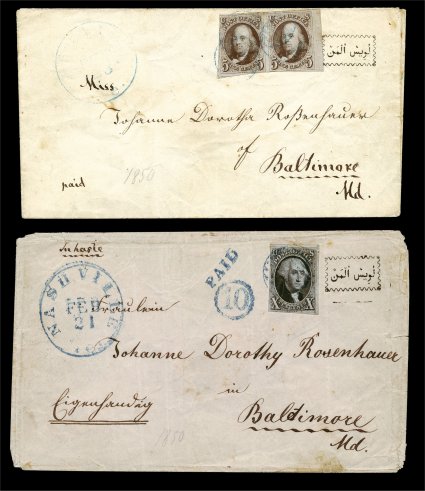 509 c 1, 2 image#1, 2, 5c Red brown and 10c Black, a most unusual matched pair of 1847 Issue covers, each imprinted on front and back with a framed Arabic imprint, both posted from Nashville, Tennessee to Baltimore paying the 10c rate for over 300 miles, the first posted on February 21st, probably 1850, with a 10c Black single with large margins to just touching and possessing a pre-printing paper fold that if opened out would show over 1mm unprinted gap in the top right corner, tied by blue grid cancel with blue "Paid" and "5" in scalloped circle handstamps at left, the second posted two days later on February 23rd with 5c Red brown right sheet-margin pair, large margins to just in at top left, possessing rich color and tied by blue grids, the covers show edge wear and mild creasing not affecting the stamps.This correspondence of two covers is, by far, among the most fascinating usages found with the 1847 Issue. The Arabic inscription when translated reads "Louise Ullman". Little is known for certain about her except that it has been speculated that she was a theologist who travelled through the Middle East. She evidently was of German descent as the addresses frequently revert to an old German script. Both covers are addressed to a Miss Johanne Dorothy Rosenhauer. The use of Arabic writing on mail within the United States, especially at this early period, is highly unusual. It is believed that this pair of covers represents the only known use of the 1847 issue on foreign language corner card covers. A very fine and remarkable pair of covers essential to the 1847 Issue specialist and/or exhibitor. (imagea) (Image) Est. 15,000-20,000
