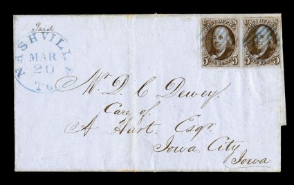 510 c 1a image#1a, 5c Dark brown, horizontal pair possessing strong rich color, tied to 1848 entire folded letter by blue grid cancels with "Nashville/Te./Mar. 20" c.d.s. at left, posted to Iowa City, Iowa, an early usage out of Nashville with this pair probably from the first delivery, well margined at top and bottom, cut just inside the frame at right and a couple of small places at left, a fine and handsome cover. (Image) Est. 500-750