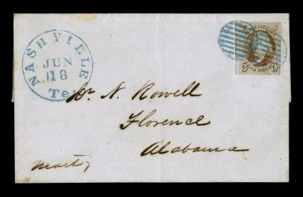 511 c 1b image#1b, 5c Orange brown, lovely left sheet-margin single with the other three margins large and balanced as well, possessing fresh bright color, tied to neat folded cover to Florence, Alabama by blue circle grids, matching "Nashville/Te./Jun 18" at left, an extremely fine and handsome single-rate cover out of Nashville. (Image) Est. 1,000-1,500