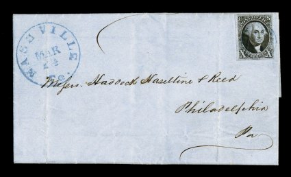 512 c 2 image#2, 10c Black, handsome single with especially sharp and detailed impression, four ample to large margins, neatly tied to 1850 entire folded letter by very light blue circular grid cancel that leaves the face virtually clear, blue "Nashville/Te./Mar 24" c.d.s. at left, normal file folds not affecting the stamp, a very fine and choice 1847 cover from Tennessee, which are not common, in fact only 19 covers bearing the Ten Cent value are recorded in Thomas Alexander's census. (Image) Est. 1,000-1,500