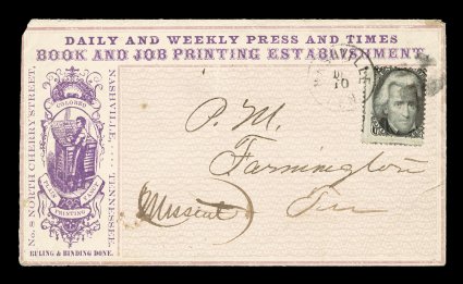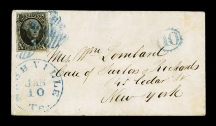 513 c 2 image#2, 10c Black, position 81R, strong impression with intense black color, clear to large margins all around, tied to petite lady's cover by blue circular grids, matching blue "Nashville/Te./Jan 10" c.d.s. below plus "10" in scalloped circle at right, trace of edge toning at bottom of the stamp, very fine and attractive. (Image) Est. 750-1,000
