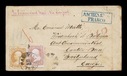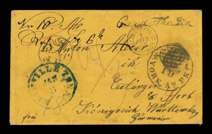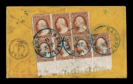 514 c 11 image#11, 3c Dull red, large bottom sheet-margin irregular block of seven, tied to reverse of 1856 transatlantic cover by three strikes of blue "Nashville, Tenn/Jan 8" c.d.s., block with strong color and mostly large margins all around, small edge tear at top of top left stamp and some minor wrinkles caused in opening; a very interesting cover paying the 21c rate to Wurttemberg via New York by American Packet, when this first reached New York it was treated as an unpaid letter and given a black "N. York. Am. Pkt./Jan 19/35" accounting c.d.s. on the front, when the stamps were found on the reverse the "35" was obliterated by a black grid and "Paid other side" written at top, a portion of the proper red New York pmk. was placed on the reverse tying the block, proper British and French transits, backstamped Horb, very fine cover with an impressive franking and a most unusual usage. (imagea) (Image) Est. 500-750