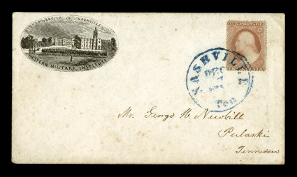 515 c 25 image#25, 3c Rose, Ty. I, tied to attractive illustrated corner card cover of the University of Nashville, Western Military Institute showing cadets on parade, stamp tied by blue Nashville c.d.s., to Pulaski, Tennessee, with enclosure, slight foxing to the envelope, very fine. (Image) Est. 150-200
