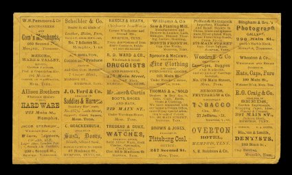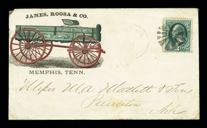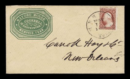 516 c imageMemphis, Tennessee advertising cover collection of 26 covers mostly of the 19th century but including a few early 20th century, starts with two different colored Gayoso House embossed cameo corner card covers, one in green with #25 franking, the other in blue with #26, also a billboard cover of about the same period with the business cards of 24 firms all over the reverse, we note several with illustrations of horses, plus numerous products including a cigar cover with #393 coil single franking and a nice liquor advertising cover with illustrated enclosure, overall fine-very fine and a nice selection of Memphis businesses. (imagea) (imageb) (Image) Est. 500-750