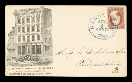 518 c 7/165 image#7/165, Nashville, Tennessee Interesting postal history collection of 30 covers through the Bank Note period, plus ten later items, some quite recent, all are from the stamp period including a few items of postal stationery with a nice 3c Rose on blue entire letter sheet (#U36), stamps start with the 1851 issue and include a 1c bottom margin strip of three (#9), a couple of #10 covers and a #11 on Morgan Co. Dry Goods advertising cover, also a block of four usage of #26, a fair number of covers with the Civil War issue including higher denominations, we also note nine foreign mail covers including two to Switzerland with #71 frankings and a strip of four of #158 on cover to China, condition varies with cover faults present but a number of attractive and very fine usages as well, examination will prove worthwhile. (imagea) (imageb) (Image) Est. 1,500-2,000