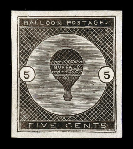 520 P CL1P image#CL1P, 5c Buffalo Balloon, proof in black on India paper, Schoendorf Ty. I, strikingly handsome proof pulled from the single impression typographed plate/die early on in its original state before the small flaws developed that Schoendorf uses to distinguish the different types, intense black color on bright white paper, the India type proof paper has taken the impression exceptionally well showing all the lines clearly, being much more detailed than the issued stamps, extremely fine; includes a photostat of an 1894 letter written by John H.B. Lillard, who produced the stamps in 1877, in there he notes that 300 stamps were issued and 23 used, he makes no mention of proofs but there were undoubtedly considerably less issued, despite the fact that the proof is priced the same as the issued stamp in the Scott catalog; air mail specialist Robert Schoendorf in his booklet The Buffalo Balloon Mail 1873-1877" comments that he knew of one example of the proof that was sold in 1975 (probably this example) and that he had seen another example in the 1930's, the whereabouts of which is unknown, furthermore, in his appendix he values the black proof at about three times the value of an unused Type I stamp; it is quite likely that the example offered here is the finer of only two or at the most three examples that are recorded; signed A. Diena. (Image) $7,500.00