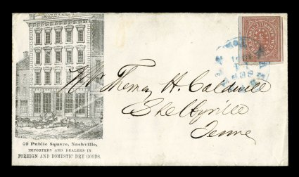 541 c 61X3 image#61X3, Nashville, Tenn., 5c Brick red on gray blue ribbed paper, fresh right margin single possessing three huge margins showing the frame line of the next stamp at left, just along the frame at bottom, tied to lovely importer's illustrated advertising cover of Morgan & Co. by blue "Nashville/Ten./Sep 14, 1861" c.d.s., illustration features the company's building with commercial activity in front showing horses with two-wheel farm carts being loaded, posted to Shelbyville,Tennessee, trivial spot of discoloration not affecting any of the elements of the cover, very fine; an exceedingly choice illustrated building advertising cover with this scarce Nashville Postmaster Provisional; 1976 PF certificate. (Image) Est. 7,500-10,000