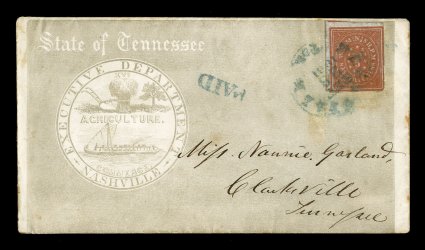 542 c 61X3 image#61X3, Nashville, Tenn., 5c Brick red on gray blue ribbed paper, ample to extra-large margins on three sides, just into frame at bottom right, bright color, tied to impressive gray all-over front State of Tennessee Executive Department illustrated cover, to Clarksville, Tennessee, stamp tied by "Nashville/Ten./Sep 28,1861" c.d.s. with matching straight line "Paid" handstamp at left, mounting marks on the reverse and a few flecks of toning at right, a very fine usage on an extremely rare and handsome all-over illustrated cover; ex-Gallagher. (Image) Est. 7,500-10,000