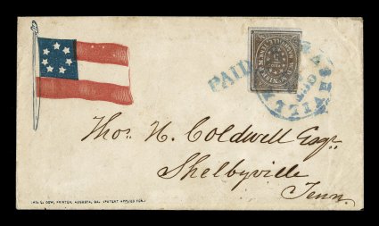 543 c 61X4 image#61X4, Nashville, Tenn., 5c Gray on gray blue ribbed paper, single in the distinctive gray shade, three large margins, just in at right, tied to attractive seven-star Confederate flag in colors patriotic cover with Jas. L. Gow imprint (Dietz #F7-16), to Shelbyville, Tennessee, clear strikes of blue "Nashville/Ten./Oct. 12, 1861" c.d.s. and matching "Paid" straight line handstamp, both tie the stamp to the cover, soiling on the reverse but very fresh and attractive on the front, a very fine and rare usage; the gray provisionals are the scarcest of the 5c values, frequently coming faulty or cutting the designs, they are particularly rare on cover and patriotic covers are not even listed in Scott or Dietz for this stamp, a wonderful and extraordinarily rare cover for the Nashville collector. (Image) Est. 7,500-10,000