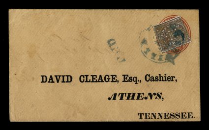 544 c 61X4 image#61X4, Nashville, Tenn., 5c Gray brown on gray blue ribbed paper, a very brown shade that falls within the various shades of the so-called gray stamps, margins clear to into the frames in varying degrees, applied over imprint of United States 3c Red on buff Nesbitt postal entire (#U10), this being used as an envelope since U.S. postage was no longer valid in the Confederate States, tied by blue "Nashville/Ten./Oct. 14, 1861" c.d.s. with matching straight line "Paid" at left, printed address to David Cleage in Athens, Tennessee, embossed imprint of Planter's Bank of Nashville on the back flap, fine and nice usage of this scarce stamp. (Image) Est. 1,000-1,500