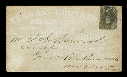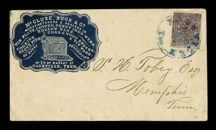 545 c 61X5 image#61X5, Nashville, Tenn., 5c Violet brown on gray blue ribbed paper, bright reddish violet shade, mostly clear to large margins, tied to marvelous blue shield cameo illustrated corner card cover for McClure, Buck & Co. metal fabricators and stove manufactures, stamp tied by clear "Nashville/Ten./Dec 6, 1861" blue c.d.s., to Memphis, Tennessee, cover is exceptionally clean and attractive, especially when compared with the majority of provisional covers, very fine; a stunning advertising cover that is particularly rare with this provisional issue; ex-Gallagher. (Image) Est. 5,000-7,500