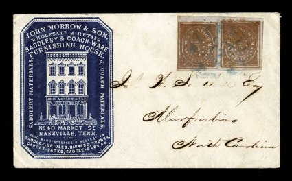 546 c 61X5 image#61X5, Nashville, Tenn., 5c Violet brown on gray blue ribbed paper, magnificent quality horizontal pair in a bright red brown shade, being exceptionally fresh on strongly blued paper, just clear to mostly enormous margins all around, this exceptional and rare pair is tied to a spectacular blue cameo illustrated advertising cover of John Morrow and Son, Nashville merchant in saddlery and coach-ware, posted to Murfreesboro, North Carolina, stamps tied by central unobtrusive strike of a single "Nashville/Ten./Oct. 17, 1861" blue c.d.s., tiny bit of addressee's name partly eradicated, extremely fine; Nashville Postmaster provisional covers with this marvelous eye appeal are of the greatest rarity; 1980 PF certificate; ex-Caspary, Haas. (Image) Est. 10,000-15,000