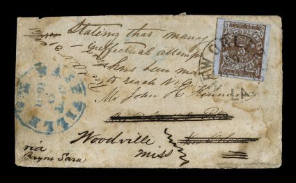 547 c 62X4 image#62X4, New Orleans, La., 5c Red brown on bluish, wonderfully choice four-margin single with deep color on strongly blued paper, tied to cover that originated in Nashville with blue "Nashville/Ten./Oct. 9, 1861" c.d.s. at left, light blue "Paid" straight line handstamp plus stamp affixed over matching "10" rate marking, stamp applied in payment of forwarding to Woodville, Mississippi and tied by "New Orleans/LA/29 Oct" black c.d.s. (stamp lifted and hinged in place to reveal the rate marking), cover has docketing at top making note of the content of the enclosure, which is included, cover with staining and edge wear with large portion of back flap missing, stamp is extremely fine; this New Orleans Provisional on cover is readily available but the usage is decidedly rare as we have never seen another where a New Orleans Postmaster Provisional was used to pay forwarding postage. (Image) Est. 500-750