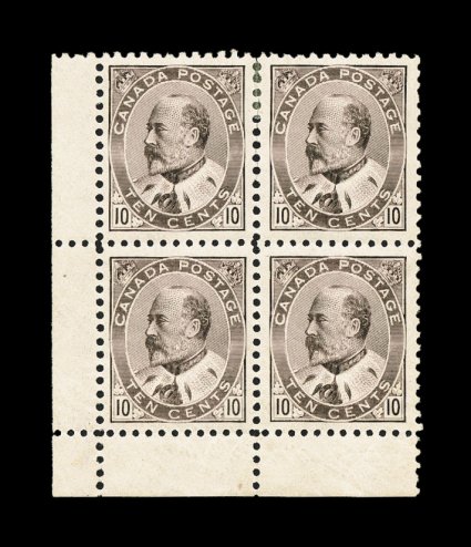 821 og/nhbl 93i image#93i, 10c Dull lilac, a handsome bottom left corner sheet-margin block of four, extraordinarily well centered overall as well as for each individual stamp, strong rich color, o.g., top stamps with small h.r. rejoining a couple of separated perfs., bottom pair n.h., extremely fine; catalog values for two hinged and two never hinged singles; 1998 V.G. Greene certificate; ex-"Crossings" Collection (Scott for normal shade $1,950.00). (Image) Unitrade C$4,000.00+