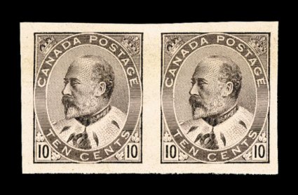 822 og 93a image#93a, 10c Brown lilac, imperforate, without gum as issued, fresh horizontal pair with large even margins, strong color and impression, extremely fine; only 100 pairs issued (Unitrade C$1,500.00). (Image) $1,000.00