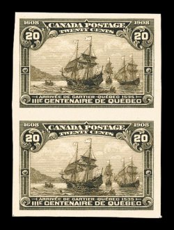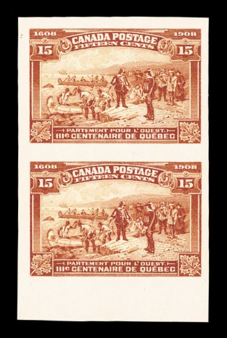 823 og 96a-103a image#96a-103a, 1/2c-20c Quebec Tercentenary, imperforate, attractive set of matched vertical pairs all from the first printing, without gum as issued, marvelously fresh, with gorgeous intensely rich colors characteristic of the first printings, each with uniformly large margins, 2c and 15c values with top and bottom sheet margins respectively, extremely fine; a very rare set as only 50 pairs of each without gum (first printing) and with gum were printed (Unitrade C$6,400.00). (imagea) (Image) $4,200.00