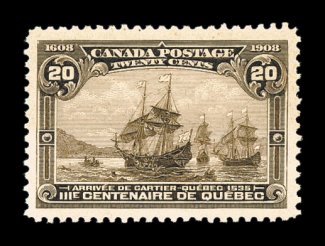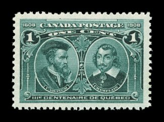 831 nh 103 image#103, 20c Quebec Tercentenary, a highly select mint single, being exceptionally well centered within very large and wonderfully well balanced margins, deeply rich color and a crisp detailed impression, immaculate o.g., n.h., an extremely fine gem; 2004 Greene Foundation certificate (Unitrade C$900.00). (Image) $500.00