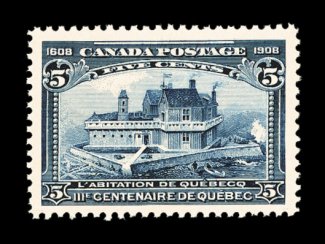 825 nh 99 image#99, 5c Quebec Tercentenary, intensely rich color and a razor-sharp impression on brilliantly white paper, exceedingly well centered with large margins, o.g., n.h., extremely fine and handsome (Unitrade C$270.00). (Image) $140.00