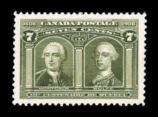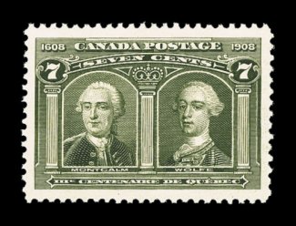 826 nh 100 image#100, 7c Quebec Tercentenary, a striking mint example in a remarkable quality that is seldom found on any of the values from this notoriously difficult set, mathematically precise centering amid lavish huge margins, rich luxuriant color and a crisp impression on bright paper, pristine o.g., n.h., an extremely fine gem jumbo for the finest collection (Unitrade C$600.00). (Image) $310.00